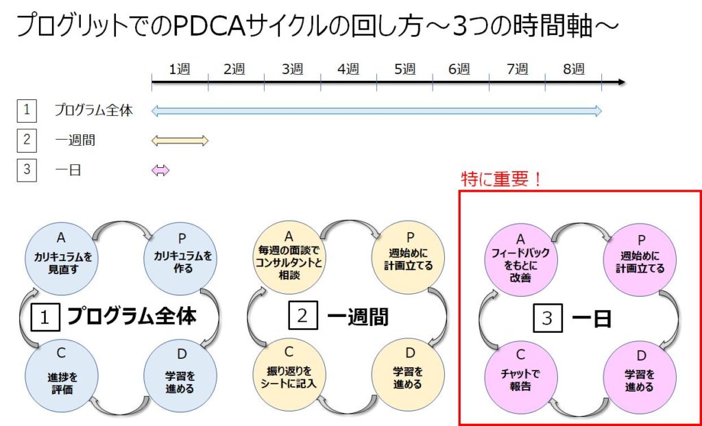 ここまで紹介してきた内容を整理すると、プログリット受講中は3つの時間軸でPDCAサイクルを回していることが分かります。