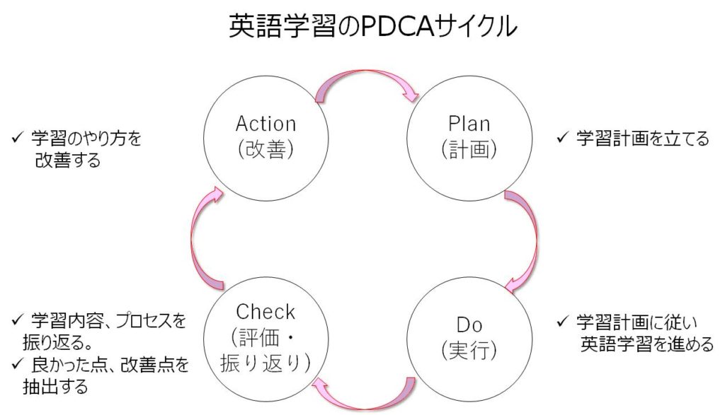 仕事でPDCAサイクルを回している方は多いかと思います。普段、仕事で実践しているPDCAを英語学習に当てはめてみる感じです。