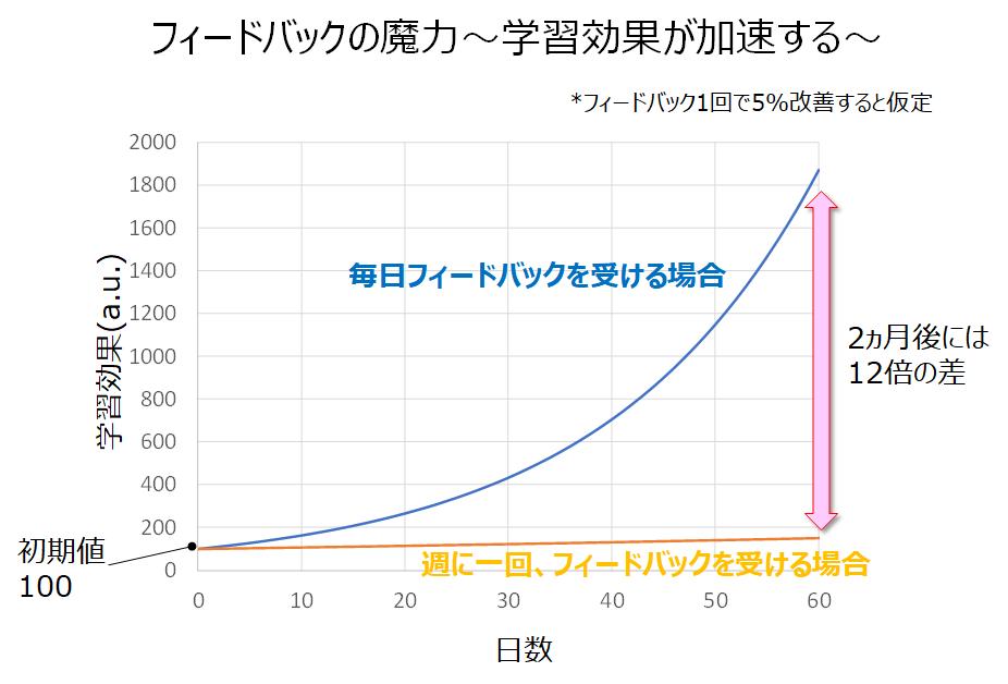 あくまでイメージ図ですが、頻繁にフィードバックを受けて改善することで、指数関数的に英語力と英語学習の生産性を高められたと感じています。