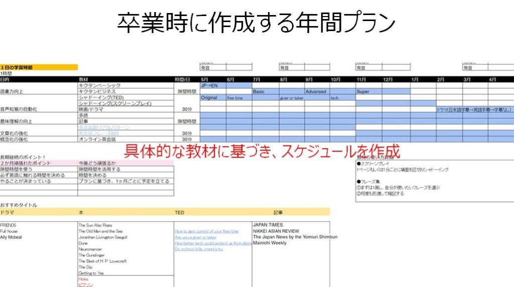 プログリットを卒業するときに、コンサルタントと一年間のオリジナル学習プランを作成します。