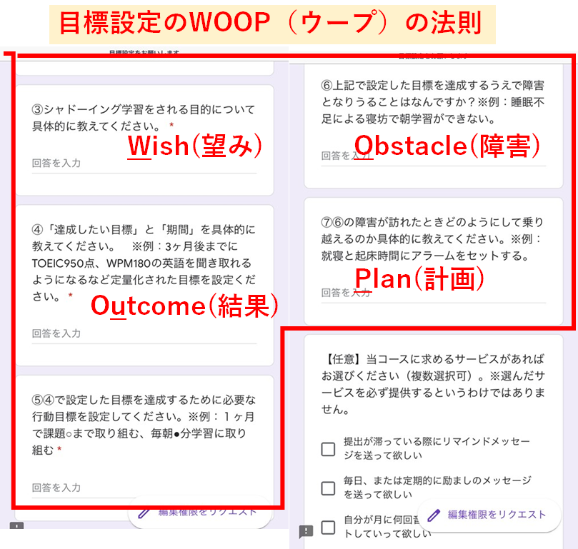 コースを始めるときに、Google formを通じて目標を設定します。具体的な目標を立てるように促されます。なぜなら、シャドーイングは楽なトレーニングではないので、明確な目標を設定しないと途中で挫折してしまうからです。