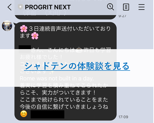 実際、私がプログリットを受講したときに感動したのはシャドーイング添削でした。毎日、シャドーイングの添削を受けられるので、日々上達していくのを実感できるからです。