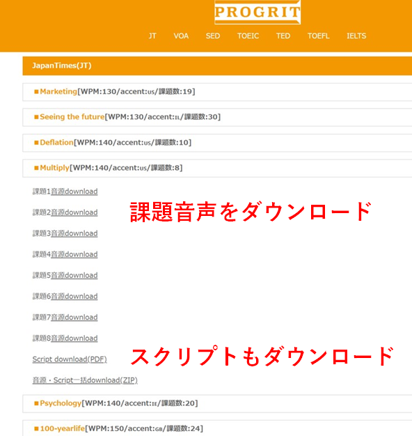 以下の画面から、教材を選び音声とスクリプトをダウンロードします。