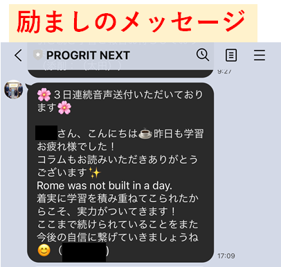 シャドーイングの添削とは別に、サポートメンバーから励ましの言葉が届きます。シャドーイングは負荷が高いトレーニングですので、一人でやると挫折してしまいがちです。しかし、励ましのメッセージをもらうと「今日も頑張ろう!」と感じられると思います。