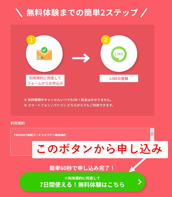利用規約を確認し、「7日間使える!無料体験はこちら」のボタンをクリックします。