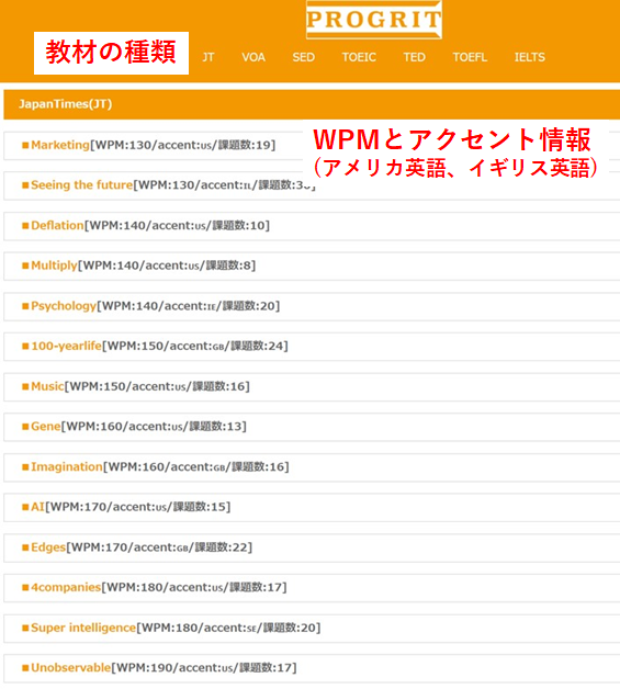 次に、プログリットの専用ページから課題として取り組む教材を選びます。これまではTEDの音声がメインでしたが、今後はより自然な英語音声であるJapan Timesの音声がメインになります(TEDのサポートは2021年1月で終了)。