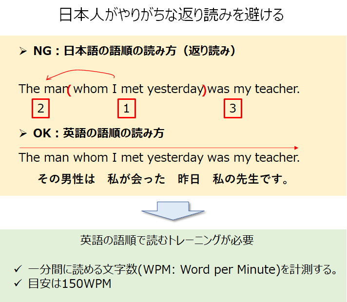 ネイティブの英語スピードについていくには、英語の語順で理解する必要があります。そのときに邪魔をするのが「返り読み」のクセです。