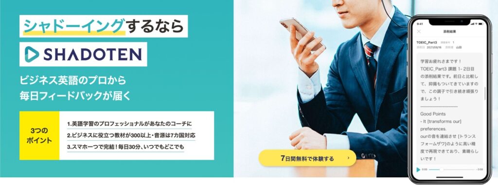 シャドテンというサービスでは、シャドーイングの音声を提出すると毎日プロの添削を受けられます。