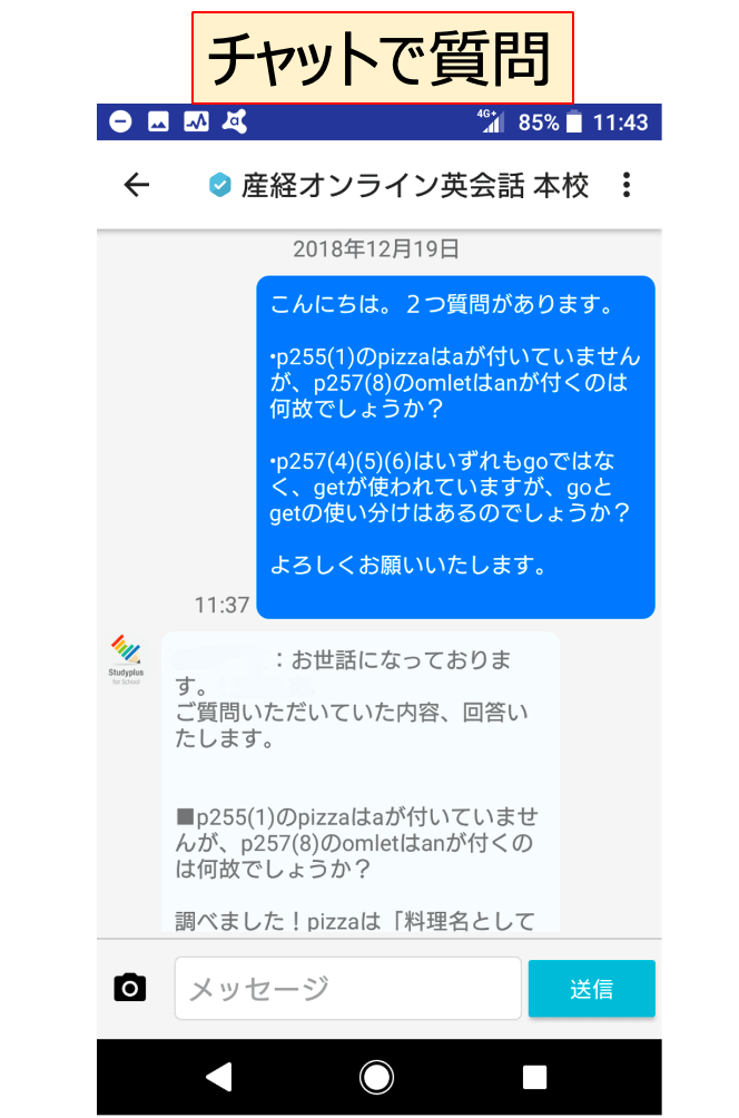 さらに、Study Plusにはチャット機能がついているので、カウンセラーに質問をすることができます。