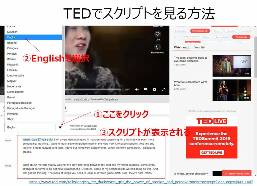 全てではありませんが、スクリプトが収録されているものがあります。下図のように3ステップでスクリプトを見ることができます。
