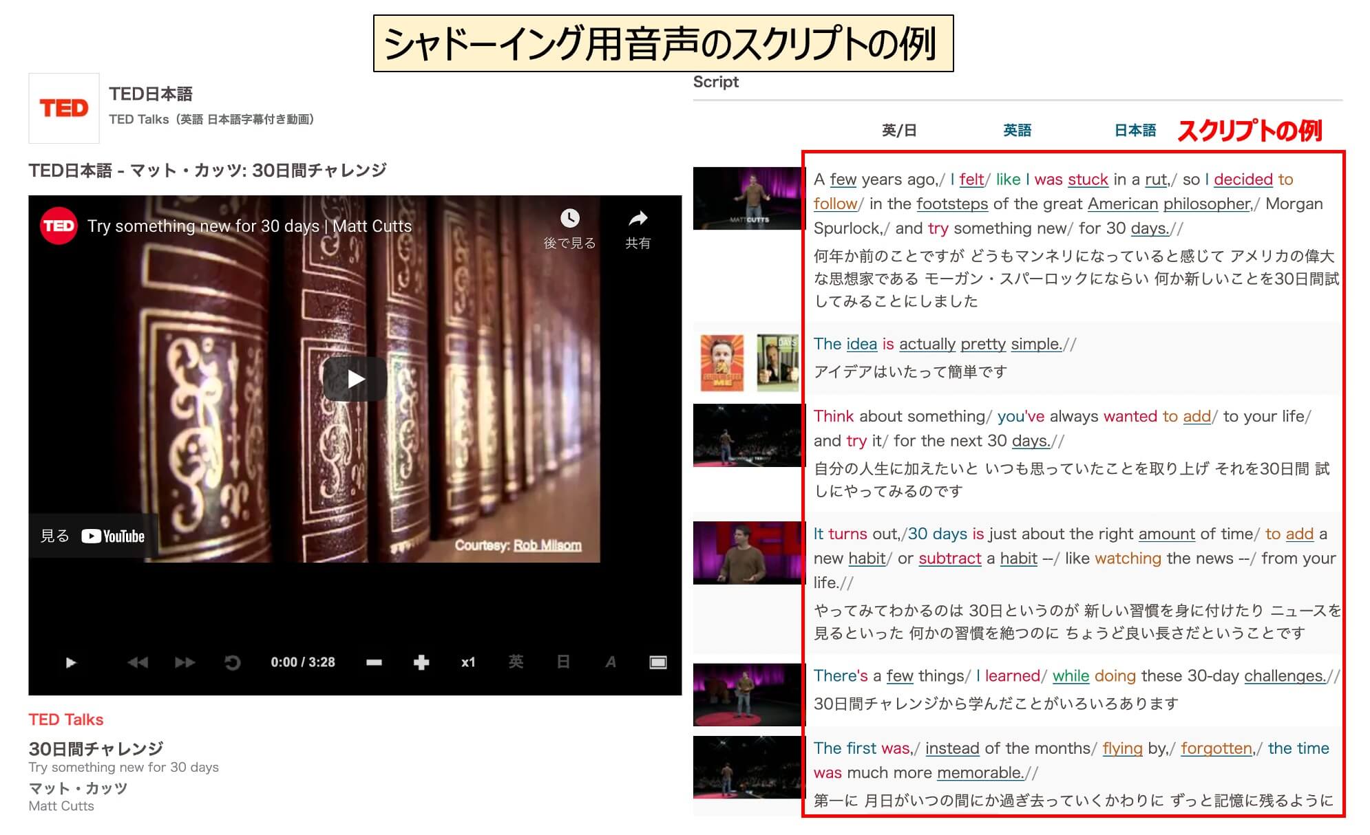 さらに、コンテンツ・シャドーイングを繰り返し行うことで、単語、文法、定型表現が定着します。