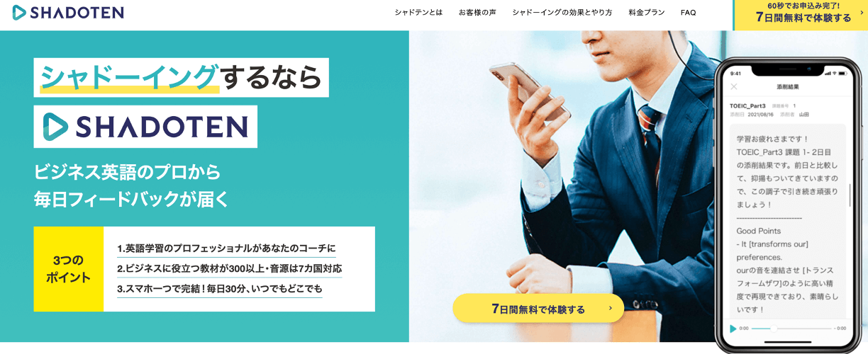 そうはいっても「やはり、一人で続けるのが難しそう......」と感じる場合は、プロからフィードバックをもらうとよいでしょう。シャドテンは、サブスク型のサービスで気軽に始められます。