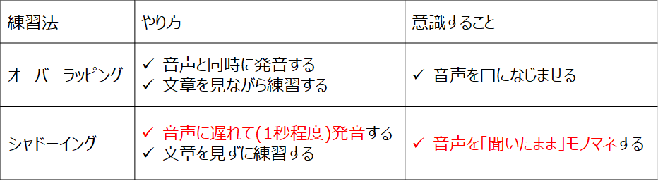 この練習をすることで、英語の音を聞き取れるようになったり、発音やリズムが改善したりします。