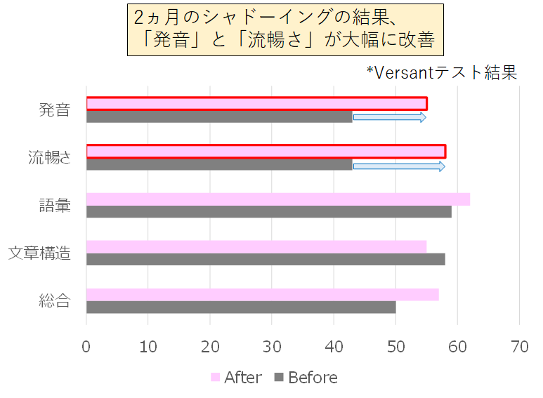 次に示すのはVERSANTと呼ばれる英語のスピーキングテストの結果です。黒い棒グラフがシャドーイングの練習前、赤い棒グラフが2ヵ月間シャドーイングのトレーニングをした後の結果です。