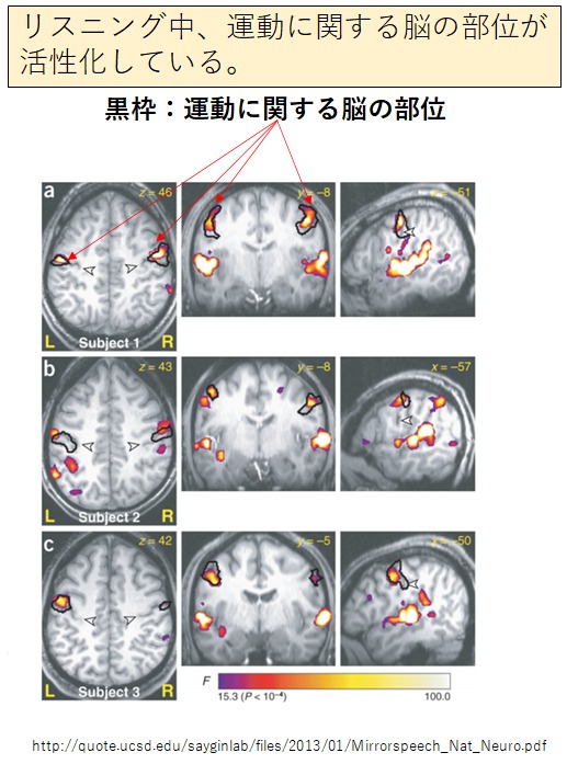 - 音を聞いたときに、「運動」に関する脳の部位が活動していることがわかった(黒く囲われた箇所が「運動」に関する脳の部位)