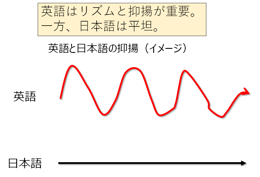 下の図は英語と日本語の抑揚のイメージです。英語にはリズムと抑揚があるのに対し、日本語は平坦な様子を表しています。