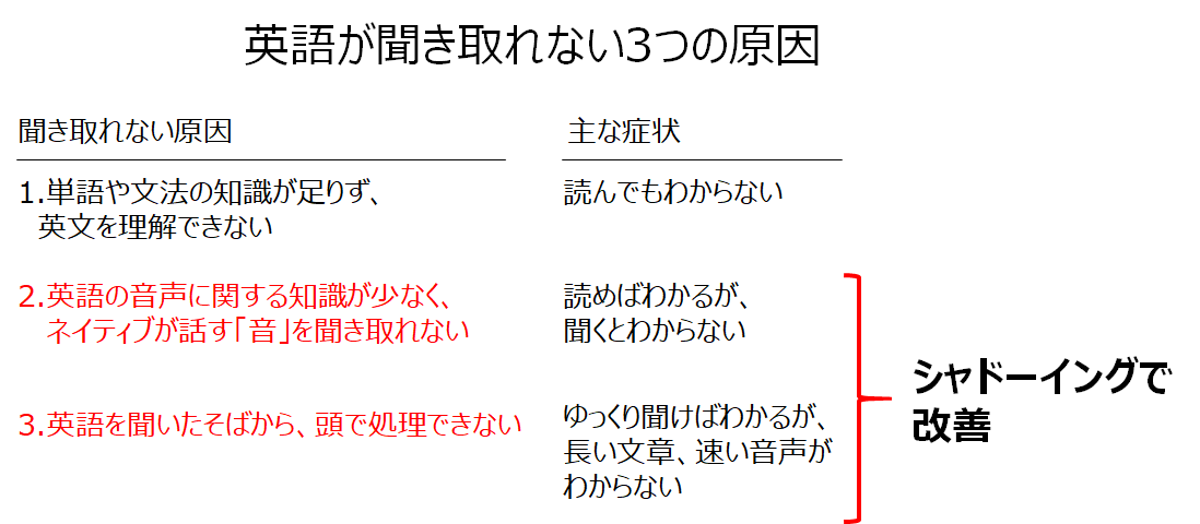 2) 英語の音声に関する知識が少なく、ネイティブが話す「音」を聞き取れない