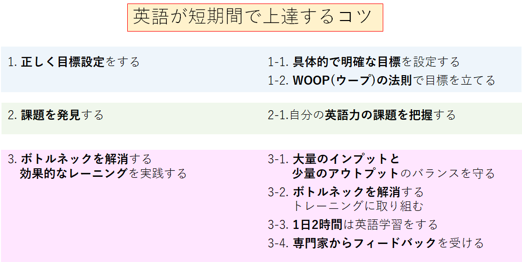 くり返しになりますが、短期間で英語力を伸ばすには以下の3つが重要です。