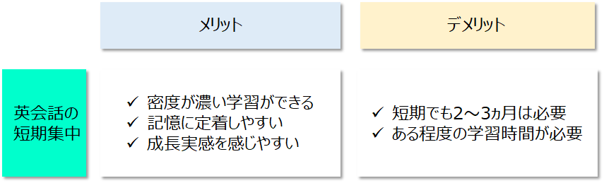 続いて、短期集中型の英会話スクールのメリットとデメリットを比較します。