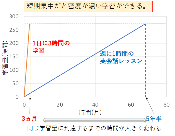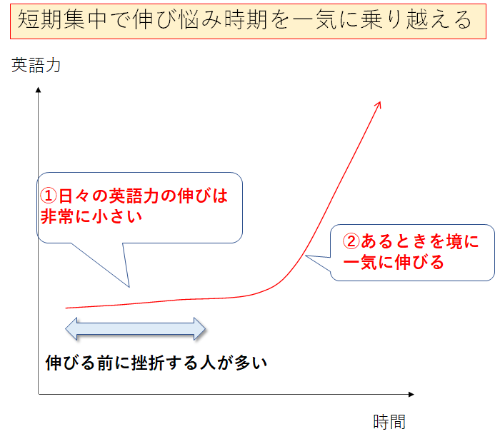 この最初の伸びない時期をいかに乗り越えるかが英語学習のポイントなんです。短期集中であれば、最初の伸びない時期を一気に乗り越えて成長曲線に乗ることができます。