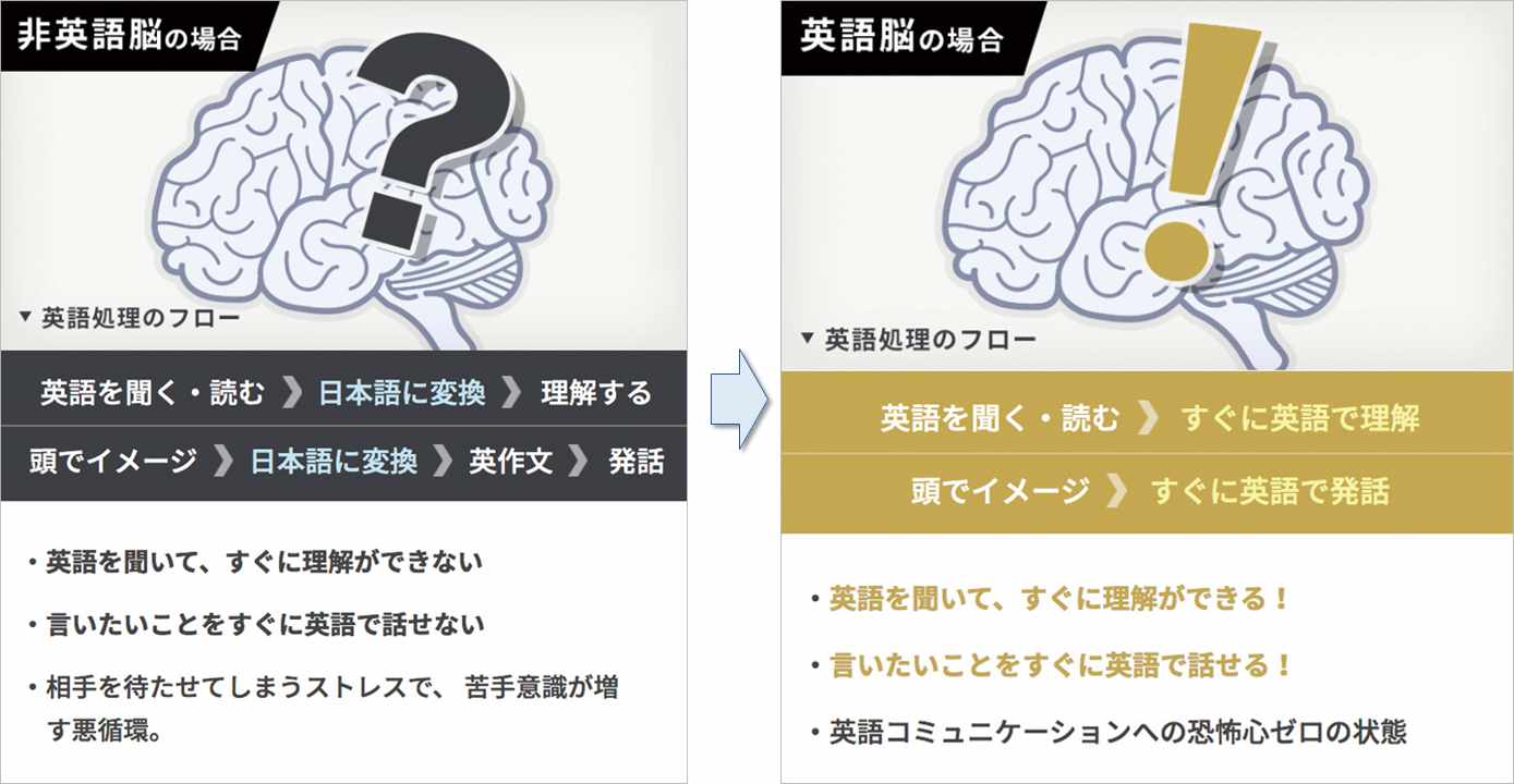 ライザップイングリッシュの特徴は、英語を英語のまま理解する「英語脳」を鍛えるトレーニングです。