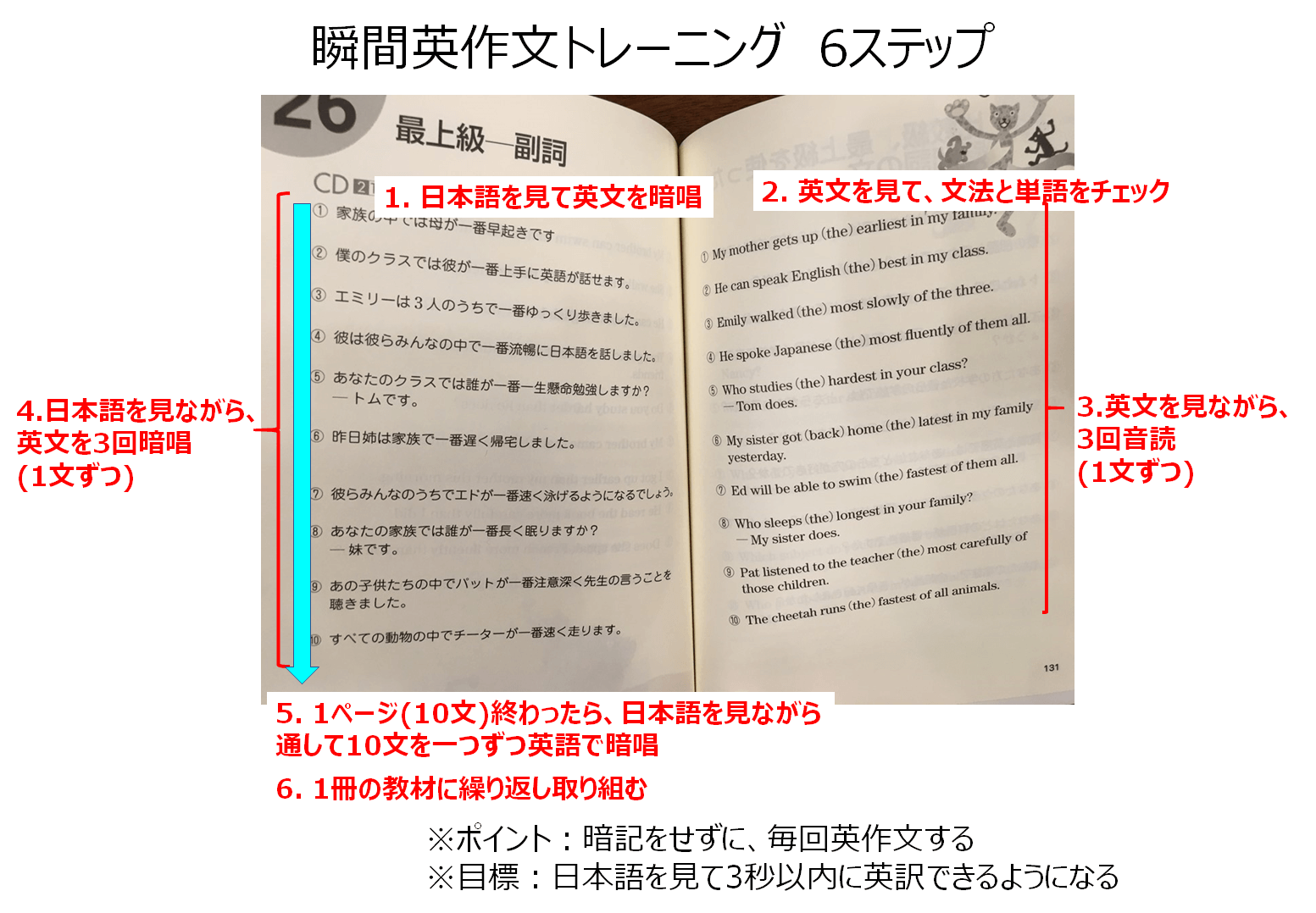 次に瞬間英作文トレーニングの効果的ななやり方を説明します。以下の6ステップでトレーニングをします。