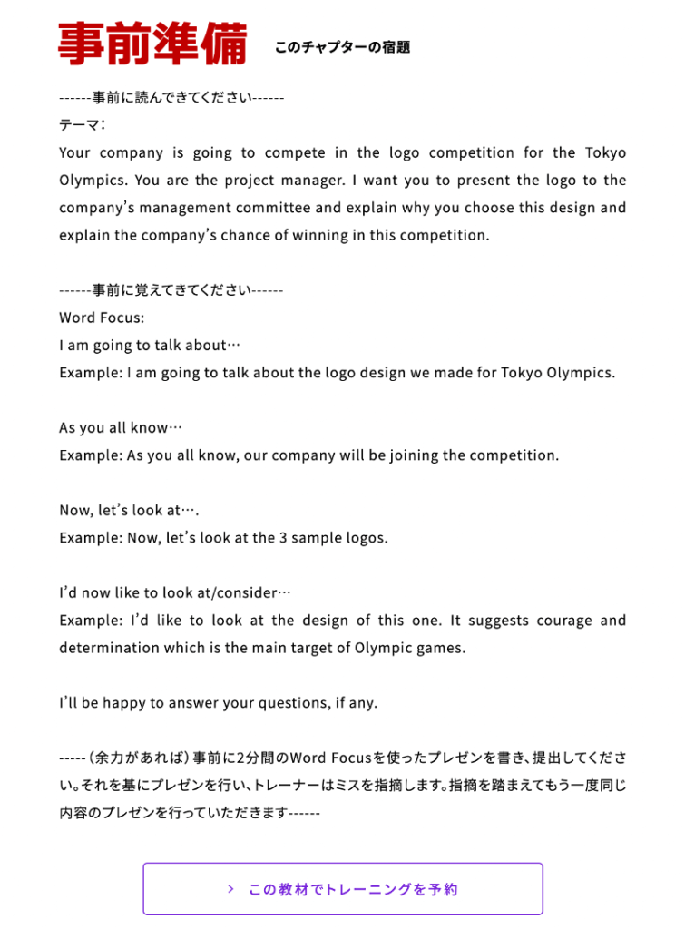 事前に2分間のWord Focus(上記で学んだ単語、フレーズ)を使ったプレゼンを書き、提出してください。それを基にプレゼンを行い、トレーナーはミスを指摘します。指摘を踏まえてもう一度同じ内容のプレゼンを行っていただきます。