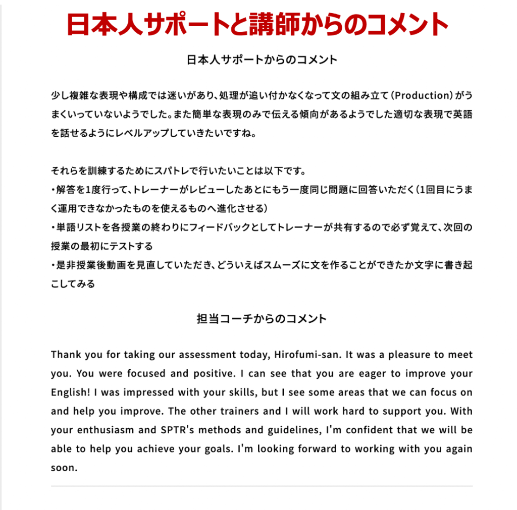 日本人サポートは、レベルチェックテストの録画を見て総評記載。弱点を克服するために、おすすめの学習法を提案してくれます。