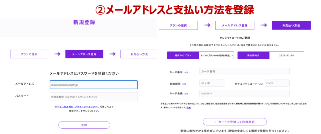 続いて、メールアドレスと支払い方法(クレジットカード)を登録すれば完了です。