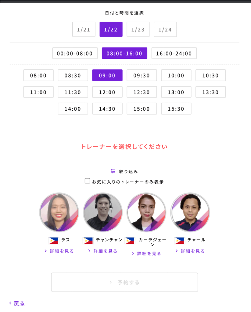何回か試してみましたが、希望時間の1時間前にチェックすると、2〜4人の講師が表示されました。