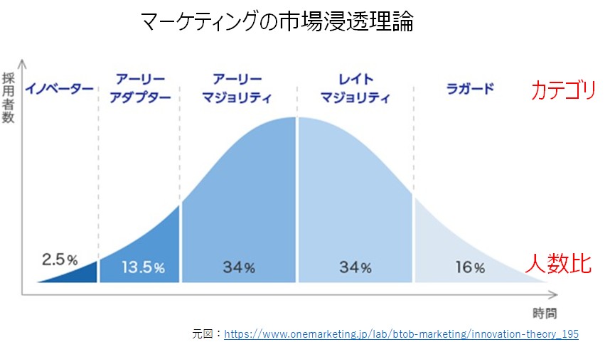 新しいアイディアや技術を採用する(購入する)人々を5カテゴリーに分類します。