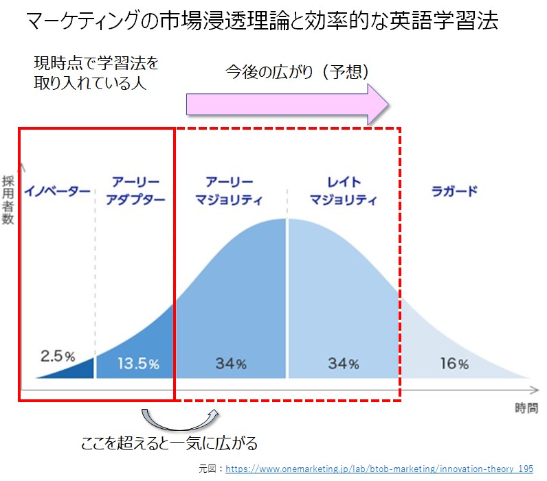 これは筆者の感覚ですが、「効率的な英語学習法」というアイディアは、はイノベーター~アーリーアダプターが採用しているステージではないかと思います。