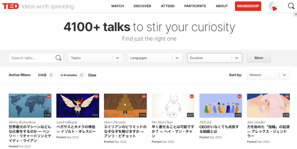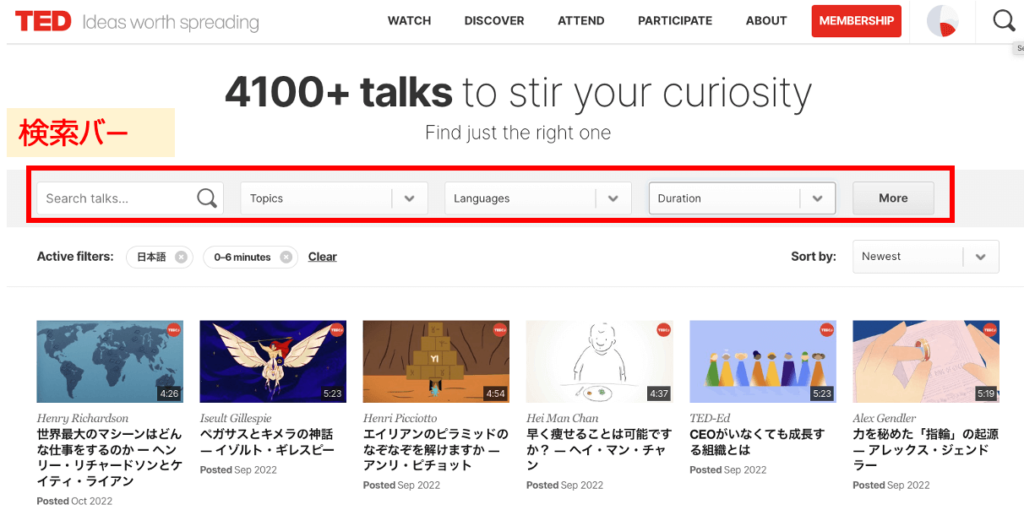 上部の検索バーで、Topics「テーマ」、Languages「言語」、Duration「尺(動画の長さ)」を指定して検索することもできます。