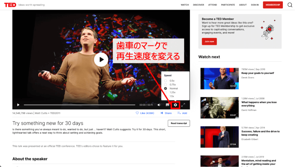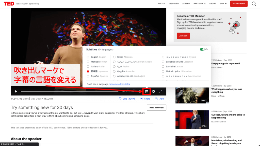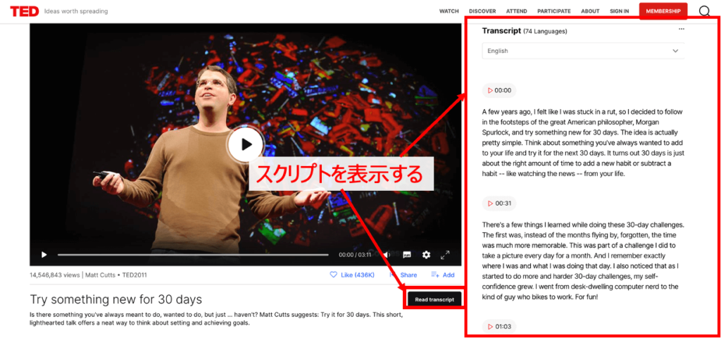 全てではありませんが、TEDの動画はスクリプトも日本語字幕も表示できるので、学習がしやすいのです。
