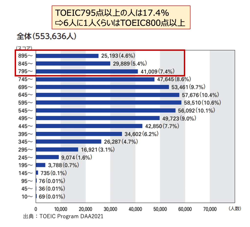 TOEICを運営するIIBC(一般財団法人国際ビジネスコミュニケーション協会)が受験者数と平均スコアをまとめた「TOEIC Program DAA2021」によると、2020年のTOEIC(L&R)公開テスト受験者のうち795点以上を取った人の割合は17.4%。およそ6人に1人が800点以上ということになりますね。
