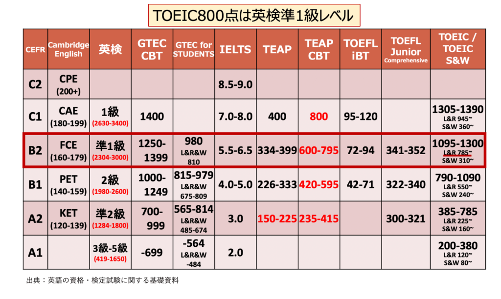 英検だと、高校英語がほぼ頭に入っていれば2級が取得できます。履歴書に記載できるのも一般的に2級からと言われているので、準1級にあたるTOEIC800点は普通よりやや高いレベルだと考えられます。