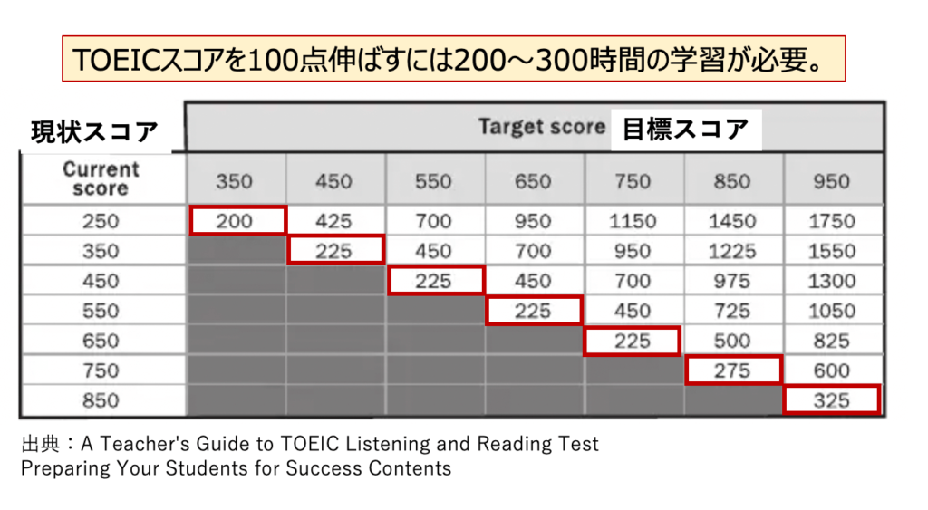 オックスフォード大学出版の資料によると、現在のスコアを100点伸ばすには、およそ200〜300時間の勉強が必要です。