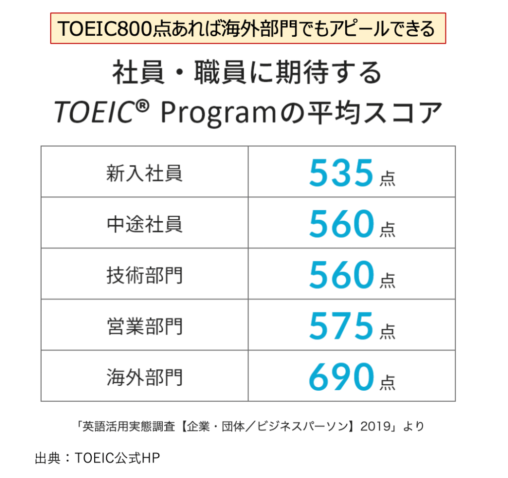 企業が社員に期待するスコアの平均は、新入社員で535点、中途社員で560点。最も英語力が求められる海外部門では690点です。