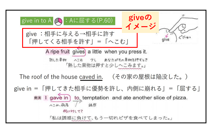 “Give”は「相手に与える」イメージであり、「相手に許す」との感覚があります。ここから派生して、「押してくる相手を許す」、つまり「へこむ」との意味となります。