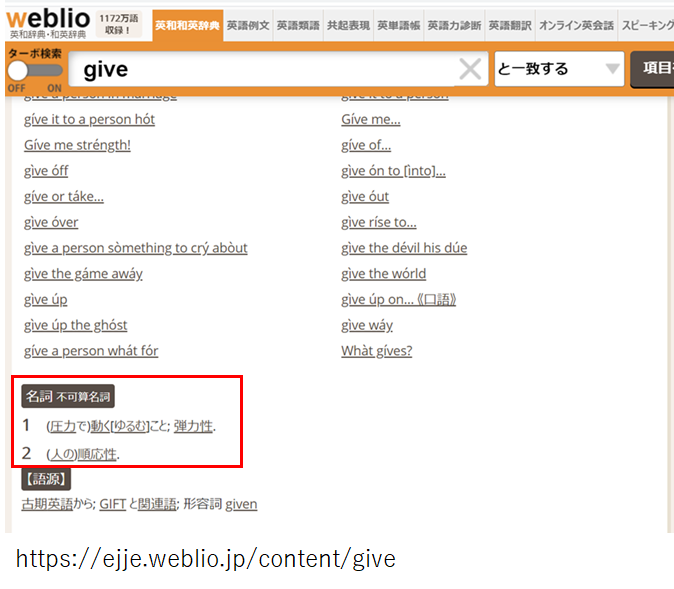 実は“give”は動詞だけでなく名詞も存在し、「弾力」という意味を表します。へこみやすさを表す意味です。