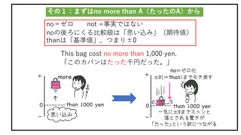2)その前に“no=ゼロ化”がつくことで、リセットされ「一気に基準の1,000円(±0)まで落とされる」感覚です。「えっ!1,000円しかしないの!?」という驚きが表現されます。