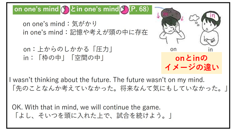 “on one’s mind”と“in one’s mind”のイメージを比較しながら見てみましょう。両者は混同しがちですが、onとinのイメージを捉えると違いがわかるようになります。