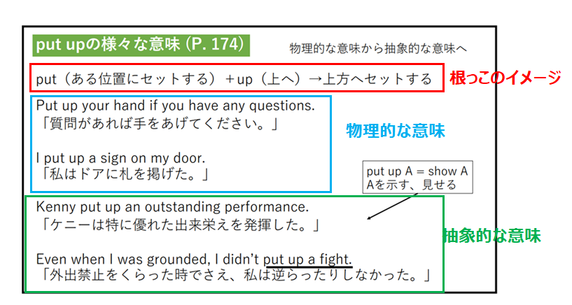 たとえば、“put up A = show A”(見せる、示す)との用法があります。