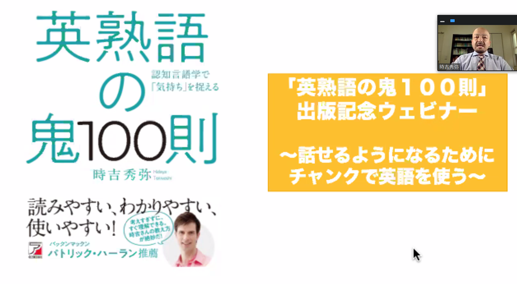 今回のセミナーは、「英熟語の鬼100則」の出版記念セミナーの位置づけです。時吉先生が2019年に出版した「英文法の鬼100則」は、7万5000部という英文法書としては異例のベストセラーになっています。今回、2020年11月13日に二冊目の本として「英熟語の鬼100則」を出版しました。