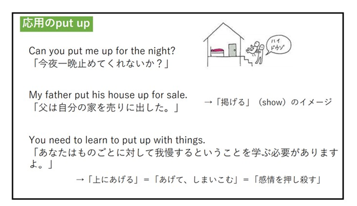 このようにメトニミーにより、一つの単語が多くの意味を持つということは、日本語でもよくあります。英語も同様で、先ほど解説した“put up”も同じように、メトニミーによりさまざまな意味で使われるようになっています。