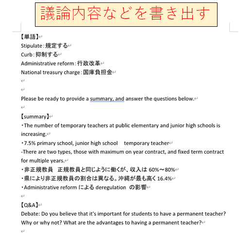 今回のトピックは筆者にとって馴染みの薄いものでした。そのため、関連する記事を日本語で読み、議論に最低限必要な内容をチェックしました。自分が詳しいトピックの場合、このプロセスは不要です。