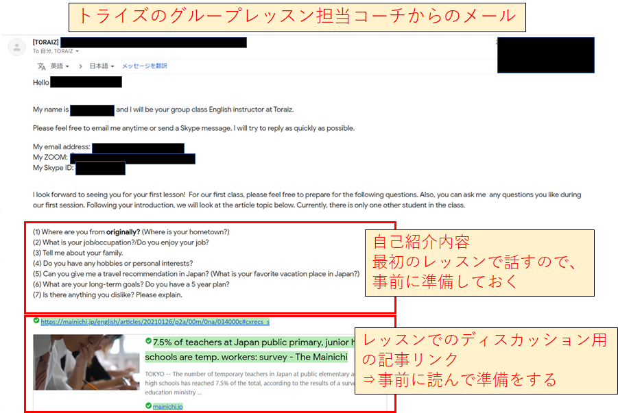 事前にグループレッスンの担当コーチからメールを受け取りました。初回のレッスンまでに準備する内容が記載されています。