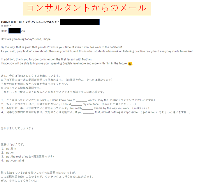 コンサルタントからメールが届くことで、「一人でやっているわけではないのだ」と感じられ、「今日もまた英語学習を頑張ろう」という気持ちになります。