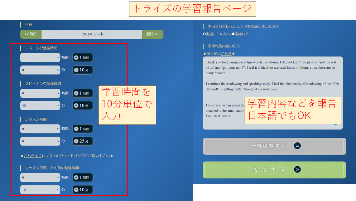 学習の進捗、困っていることなどを書きます。筆者はコンサルタントから、「できれば英語で報告を書いてみてください」と言われたので、英語で書いていますが日本語でもOKです。