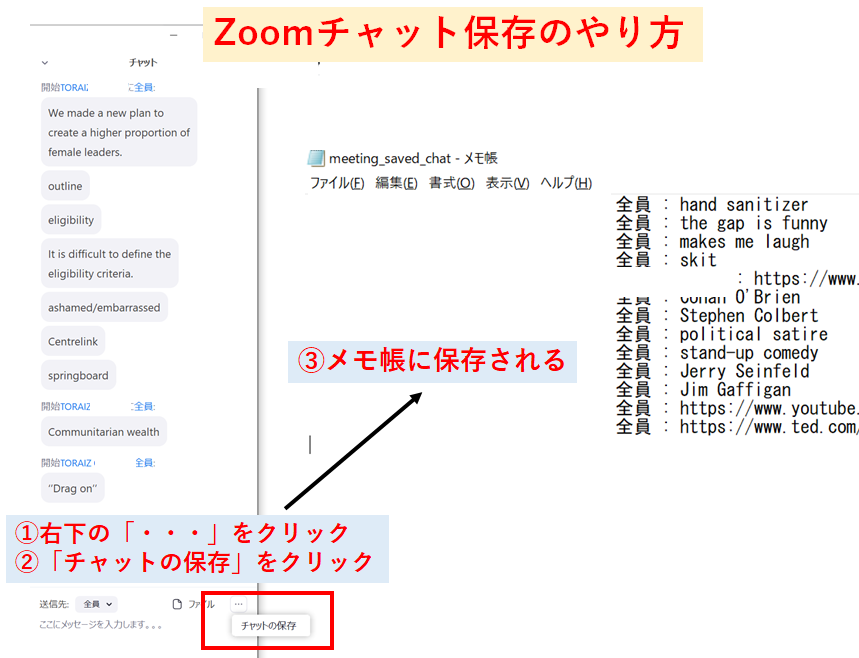 Zoomのチャットには保存機能があります。保存したチャットを後で見返すことで、新しい表現や単語を覚えられるようになります。これまでは、チャットで打ち込まれた内容をコピペしていましたが、チャット保存機能を使う方が圧倒的に便利です。